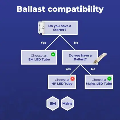 A ballast can be seen as an energy regulator that switches on the lighting. Is there a starter in the fixture? Then this is a conventional ballast (EM). Fixtures with an electronic ballast (HF) don't have a starter. A LED driver can be compared to an electronic ballast and only works with LED lighting.