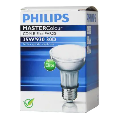 CDM-R Elite are compact discharge lamps equipped with reflectors with a very good lumen maintenance from the first to the last use. Philips CDM-R Elite 35W 930 E27 PAR20 30D have a E27 base type, which allows them to fit perfectly in your old fixtures. With a long average life of 15000 hours, Philips CDM-R Elite 35W 930 E27 PAR20 30D halogens are economical and do not require frequent replacement.
